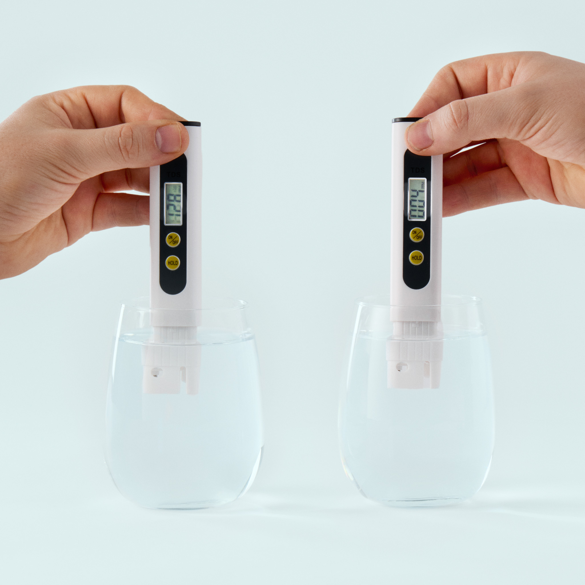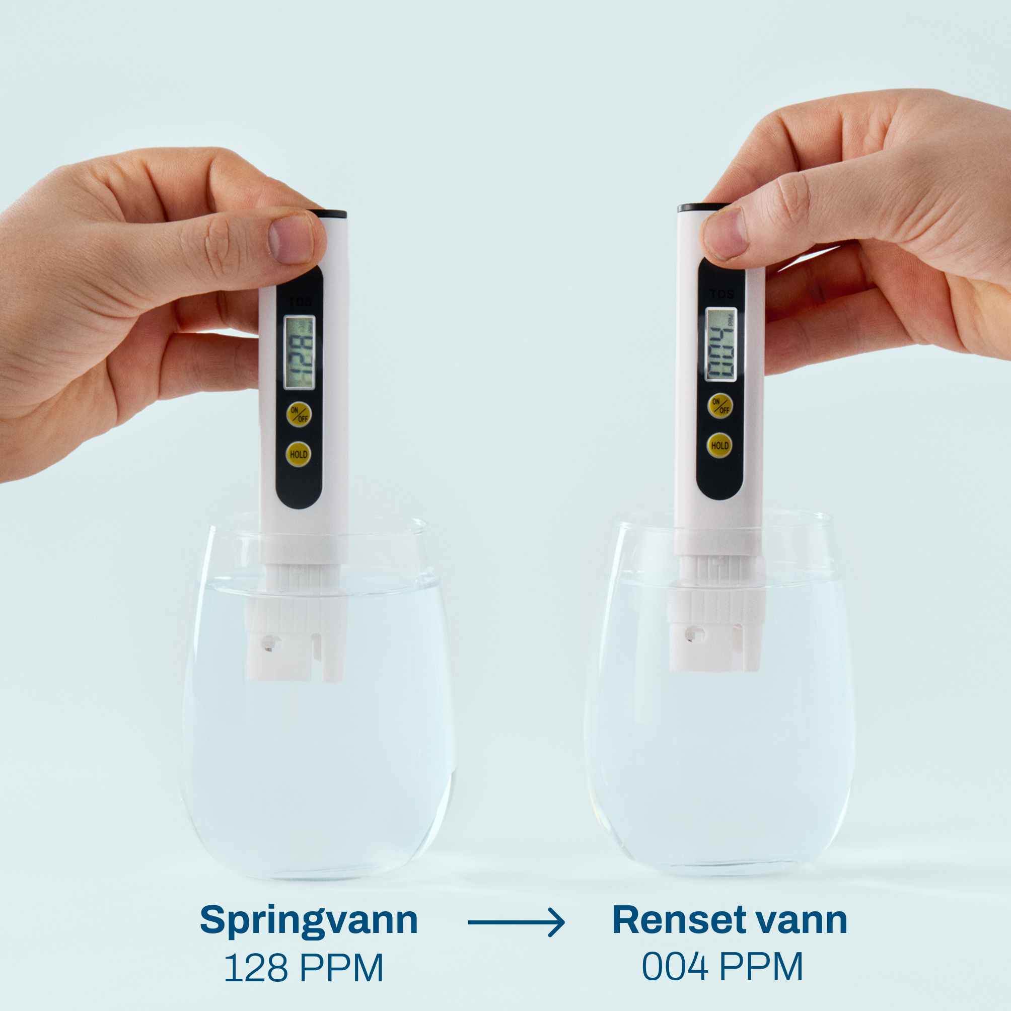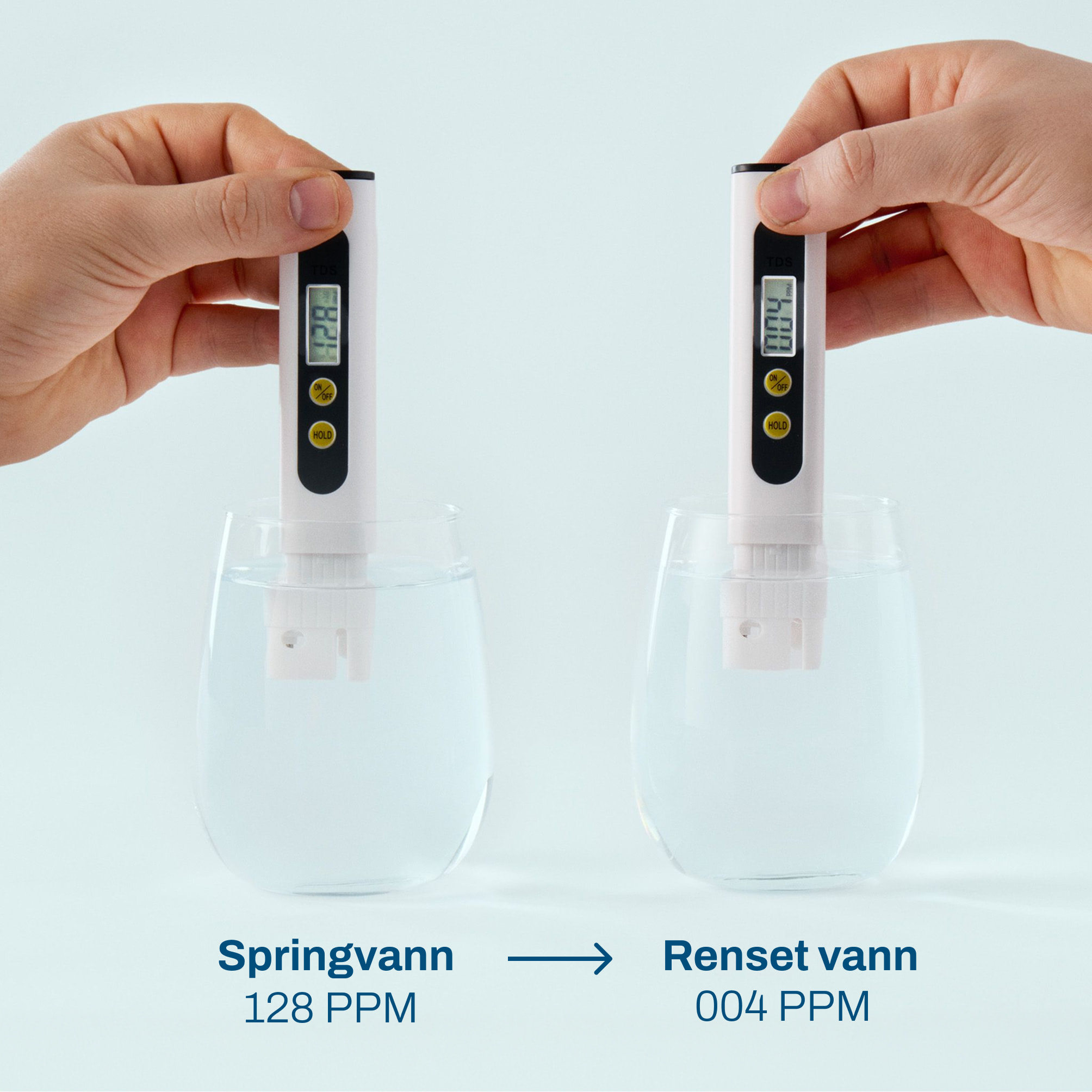 Før og etter omvendt osmose med en sertifisert TDS Måler for rent vann